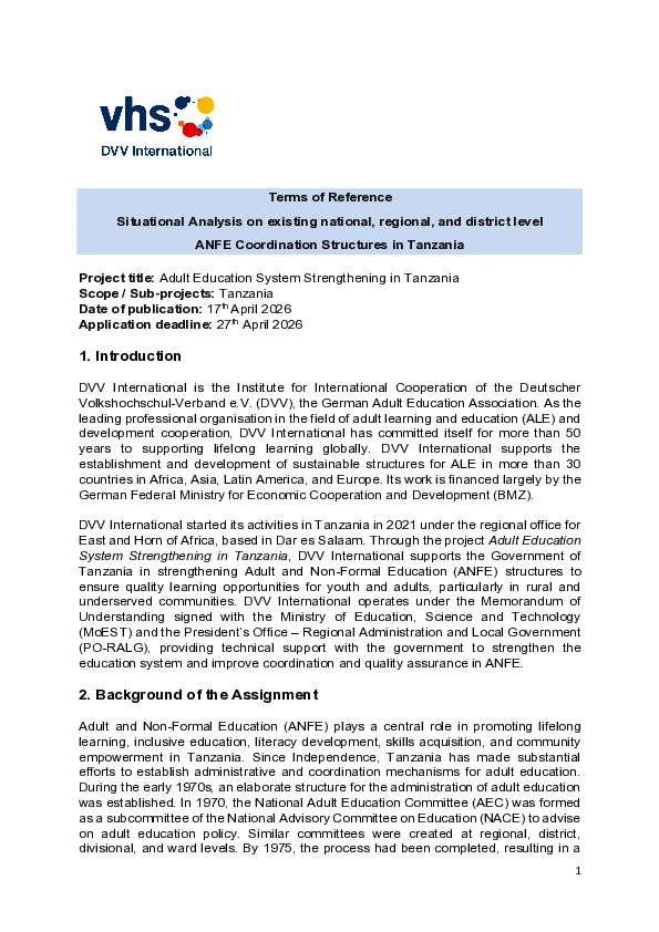 DVV International invites qualified consultants or consultancy teams to conduct a comprehensive situational analysis of existing national, regional, and district-level Adult and Non-Formal Education (ANFE) coordination structures across Tanzania.