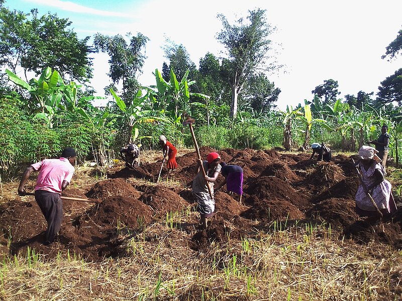 During their situation analysis activity, Tukole ICOLEW CEG identified the challenge of insufficient food among several learners’ households (HHs). The HHs practice farming for both food and income generation. Farming practices, however, are labour and capital intensive. The members overcame the challenge by pulling labour, working together, and improving their gardens. They clustered themselves in smaller groups of 8 neighbouring households and cleared their respective gardens: digging holes (3*2ft) for planting banana suckers and heaps for sweet potatoes. Each member would dig 4 holes for banana planting on days after attendance of their classes.